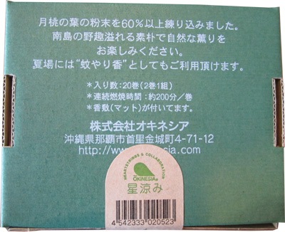 お香の薫りや煙で住空間に幕(スクリーン)を張り、蚊を追いやったり寄せつけないようにします。虫を殺すほどの強い成分は含まれておりません。野趣あふれる素朴で自然な薫りが特徴です。月桃の放つ芳香成分が気分を和らげます。お香ひと巻で連続3時間以上の焚きこみが可能です。アロマテラピーは燃焼後の残留芳香でもしばらく持続されます。 ショウガ科ハナミョウガ属の月桃(げっとう)は琉球列島の山野に自生しています。畑や藪に入るとき葉を身体にこすりつけ虫に刺されないようにしたり、鬼餅を生葉で包みカビを押さえたり、衣類タンスに葉を入れ防虫剤にしたり、古来より生活の中で多用されて来ました。また月桃の芳香には気持ちを落ち着かせる成分が含まれており、アロマテラピー用のエッセンシャルオイル(精油)としても注目を集めています。